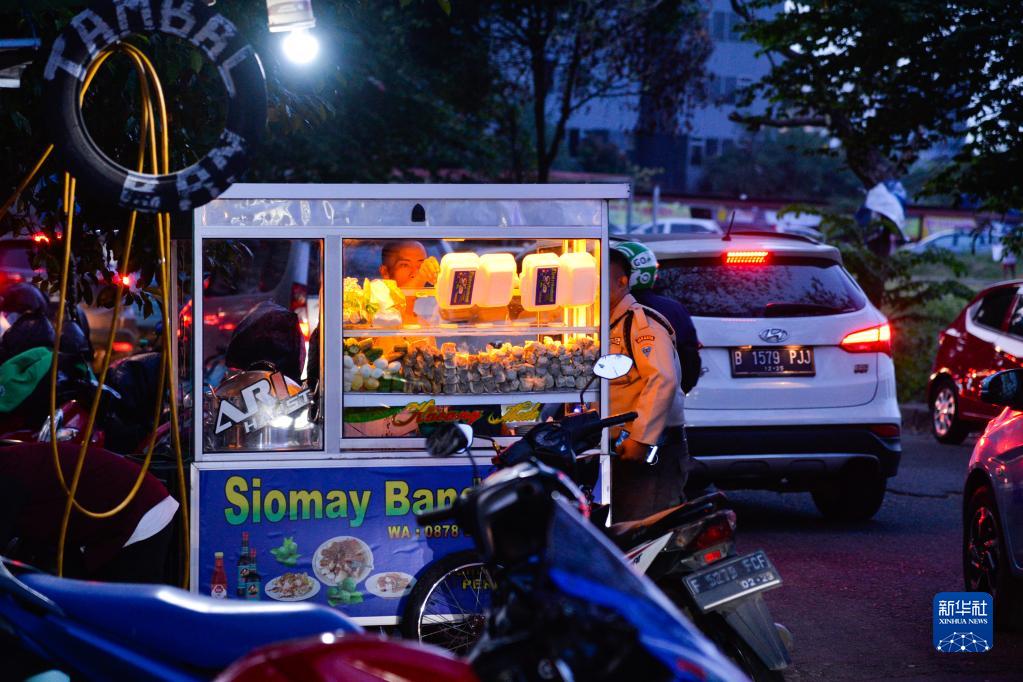 8月1日,一名商贩在印度尼西亚首都雅加达街头为顾客挑选小吃。