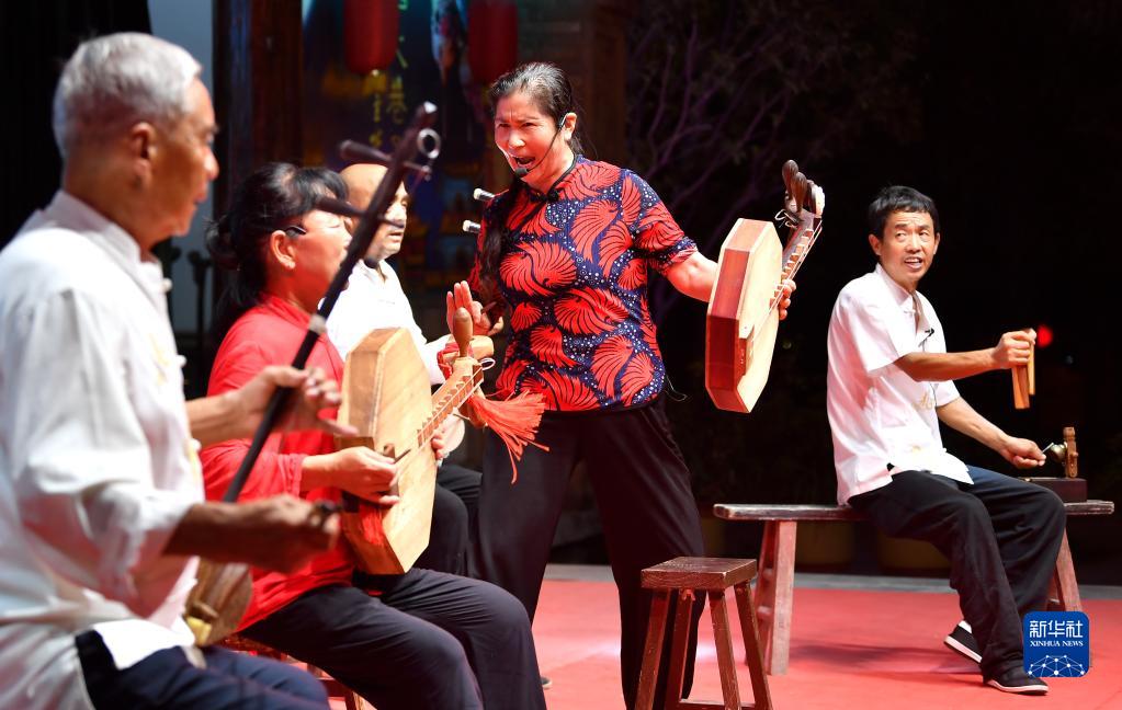在西安周至水街烟火巷子,演员在表演华阴老腔(8月6日摄)。