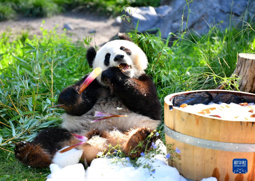 8月31日,在德国柏林动物园,大熊猫“梦想”享用“生日桶”。