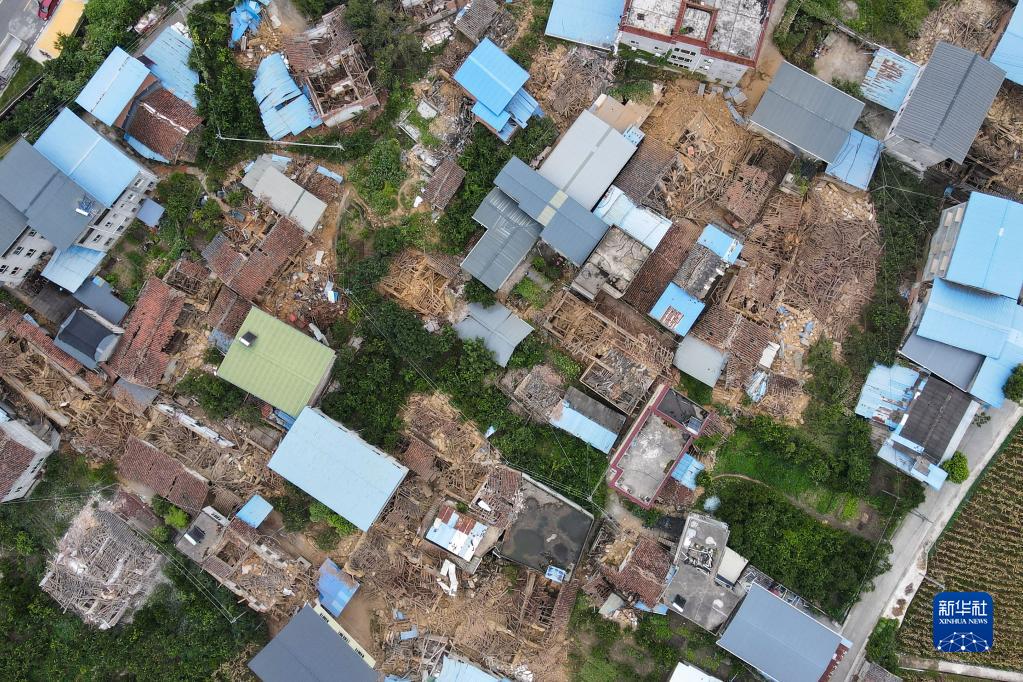 这张拍摄于9月6日的照片显示石棉县王岗坪乡部分老旧房屋倒塌(无人机照片)。