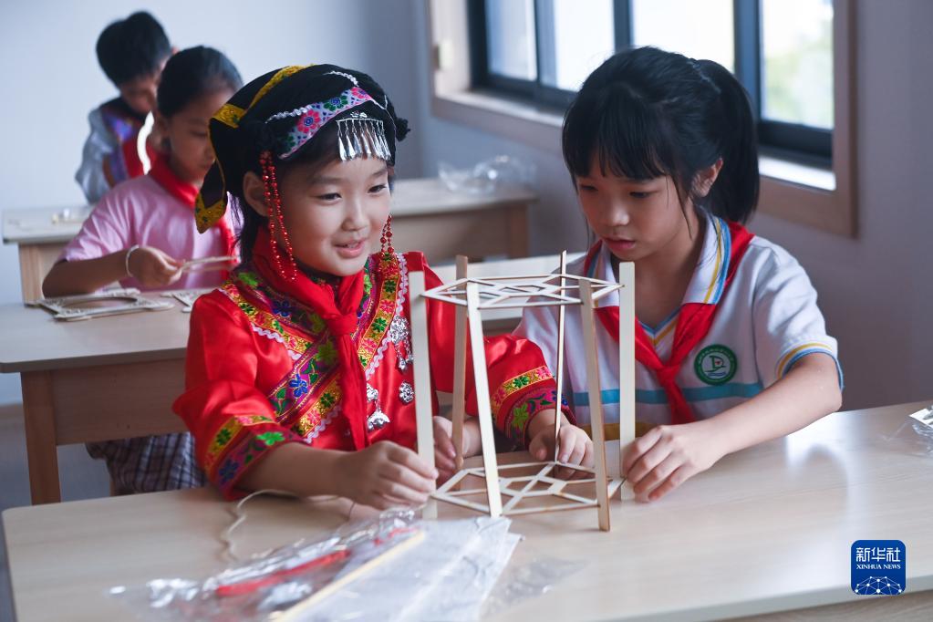 9月7日,多个民族的孩子们在东林镇星火村参加迎中秋做花灯活动。