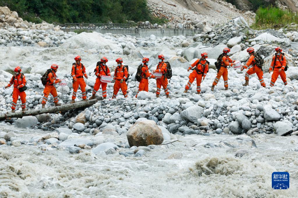 9月8日,在四川省甘孜州泸定县磨西镇附近,救援人员站在临时架设的小桥上向河对岸的村民运送生活物资。