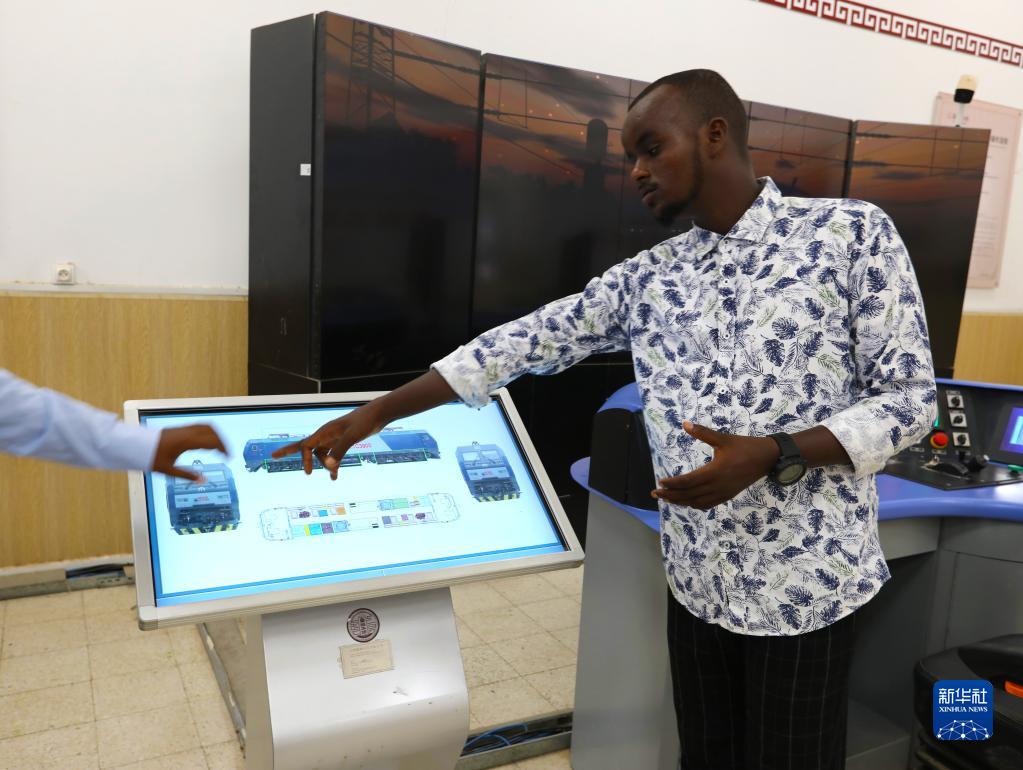 9月19日,在位于吉布提首都吉布提市的吉布提工商学校,学生在鲁班工坊使用电子触摸屏。