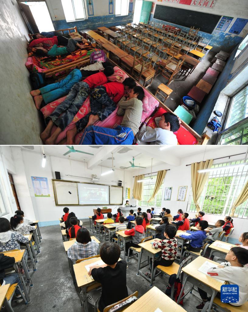 上图:在广西都安瑶族自治县隆福乡渔洞小学,孩子们在教室里睡午觉。那时候,教室也是宿舍(2012年5月30日摄);下图:在渔洞小学,孩子们在宽敞明亮的多媒体教室上课(2022年5月26日摄)。近10年来,学校修建新的教学楼、宿舍楼、篮球场、食堂等,办学条件得到极大改善。 位于桂西、桂北的大化、都安、融水、融安等地,地处滇桂黔石漠化片区,自然条件恶劣,曾是国家和广西扶贫开发工作重点县。十年来,通过持续推进农村基础设施建设,狠抓特色产业发展,全面落实教育惠民政策,强化粤桂协作等,各地区如期脱贫摘帽,实现整体消除绝对贫困,开启乡村振兴的新征程。如今,大山里的生产生活条件得到明显改善,经济社会发展日新月异,群众的获得感、幸福感、安全感不断增强。 新华社记者 黄孝邦 摄 |