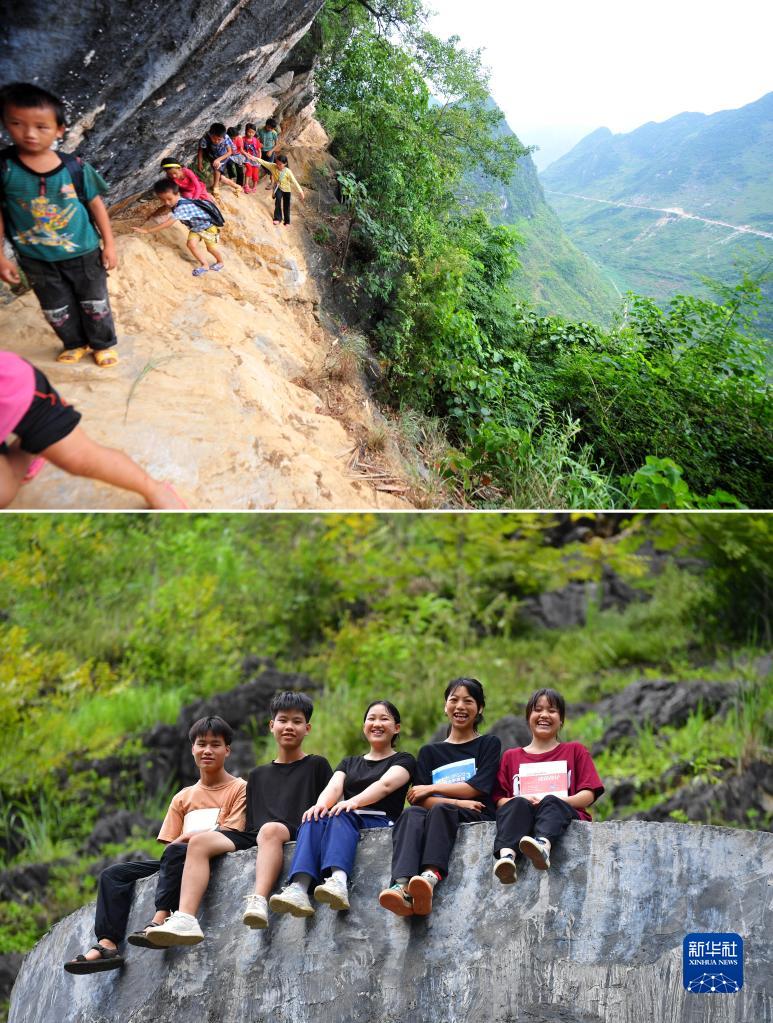 上图:在广西大化瑶族自治县板升乡弄雷村哈保屯,11岁的蒙秋艳(右一)在悬崖边护着低年级的小伙伴回家(2012年9月3日摄);下图:已经是广西医科大学大二学生的蒙秋艳(中)和小伙伴们在家门口合影(2022年8月23日摄)。10年前,弄雷村哈保屯有一处约300米长的半山悬崖,是屯里10多名小学生上学的必经之路。10年过去了,屯里的人早已搬迁到公路旁。当年爬悬崖求学的孩子们有的在读高中,有的读中专,有的考上了大学(拼版照片)。 位于桂西、桂北的大化、都安、融水、融安等地,地处滇桂黔石漠化片区,自然条件恶劣,曾是国家和广西扶贫开发工作重点县。十年来,通过持续推进农村基础设施建设,狠抓特色产业发展,全面落实教育惠民政策,强化粤桂协作等,各地区如期脱贫摘帽,实现整体消除绝对贫困,开启乡村振兴的新征程。如今,大山里的生产生活条件得到明显改善,经济社会发展日新月异,群众的获得感、幸福感、安全感不断增强。 新华社记者 黄孝邦 摄 |