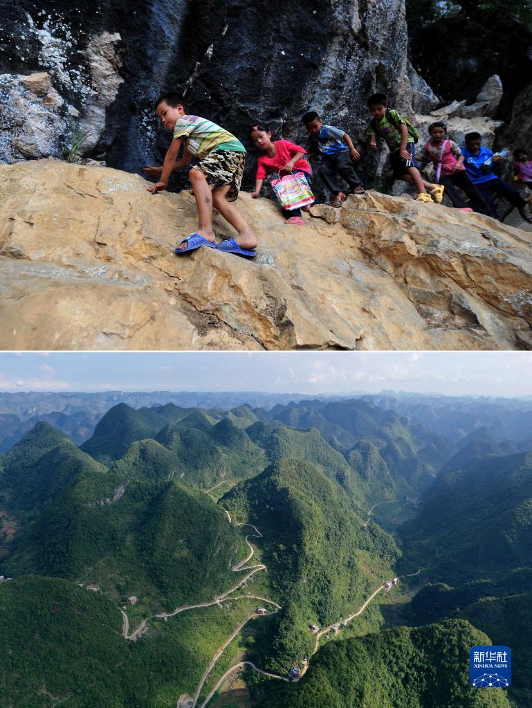 上图:在广西大化瑶族自治县板升乡弄雷村哈保屯,孩子们放学后爬悬崖回家(2012年9月5日摄);下图:如今的弄雷村已实现屯屯通公路(2022年8月23日摄)。当年爬悬崖求学的孩子们,有些已经考上大学,有些还在读高中,有的读中专(拼版照片)。 位于桂西、桂北的大化、都安、融水、融安等地,地处滇桂黔石漠化片区,自然条件恶劣,曾是国家和广西扶贫开发工作重点县。十年来,通过持续推进农村基础设施建设,狠抓特色产业发展,全面落实教育惠民政策,强化粤桂协作等,各地区如期脱贫摘帽,实现整体消除绝对贫困,开启乡村振兴的新征程。如今,大山里的生产生活条件得到明显改善,经济社会发展日新月异,群众的获得感、幸福感、安全感不断增强。 新华社记者 黄孝邦 摄 |