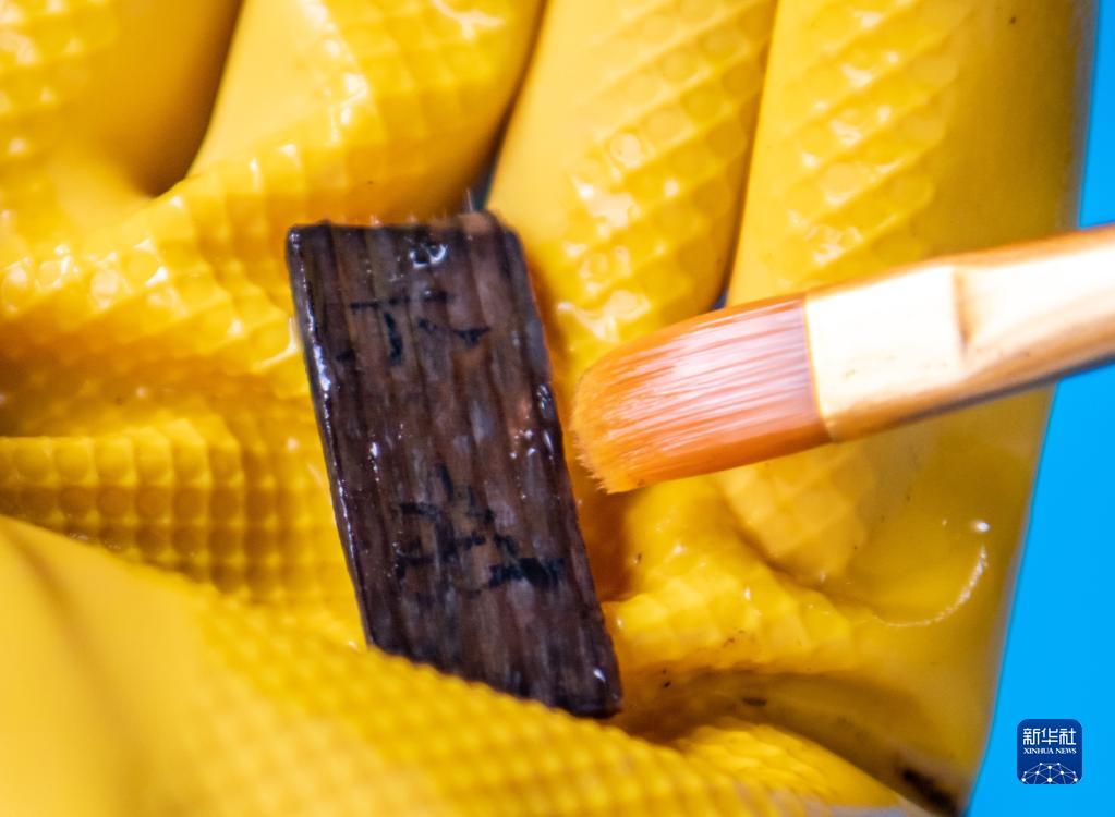 考古工作者在清理云南河泊所遗址出土的简牍(2022年9月21日摄)。