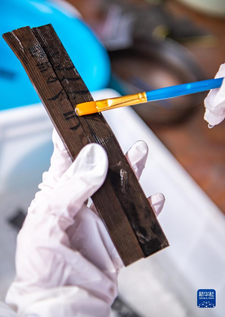 考古工作者在清理云南河泊所遗址出土的简牍(2022年9月21日摄)。