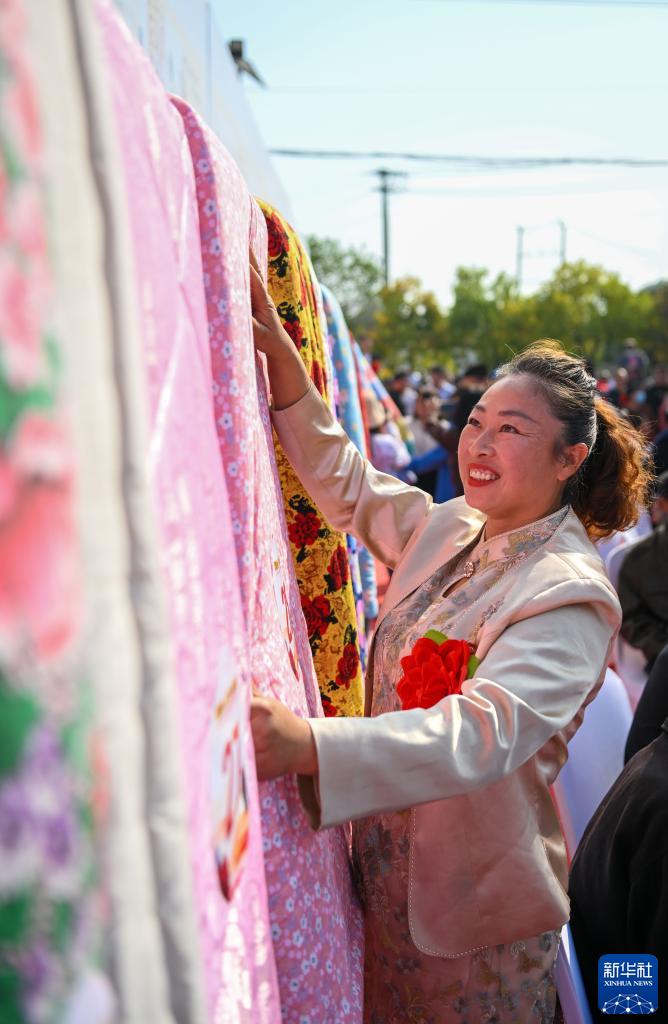 9月28日,在天津市蓟州区罗庄子镇杨家峪村,村民在重阳节“晒被子”活动中整理被子。