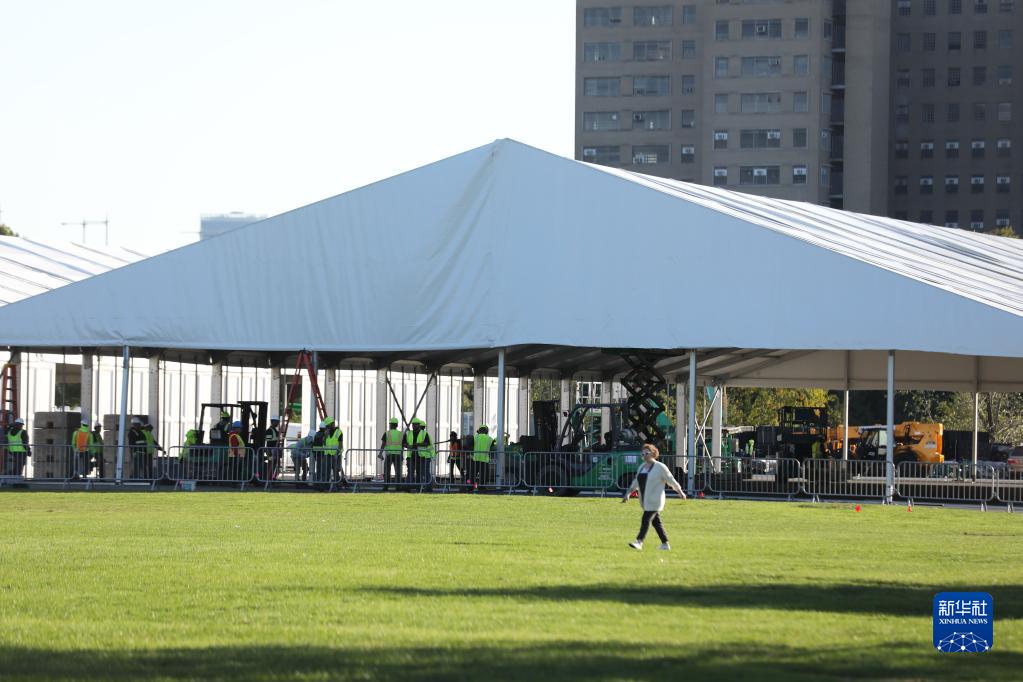 10月9日,工人在位于美国纽约市兰德尔岛的移民救援中心建设工地工作。