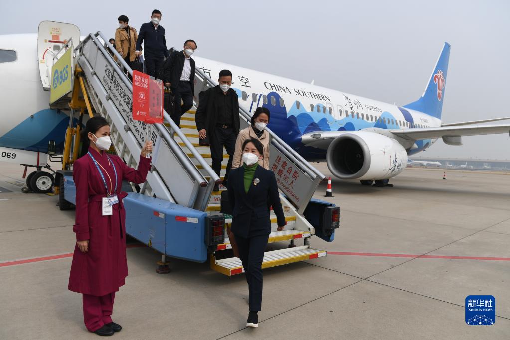 10月13日,来自贵州省的党的二十大代表乘飞机抵达北京首都国际机场。新华社记者 张豪夫 摄