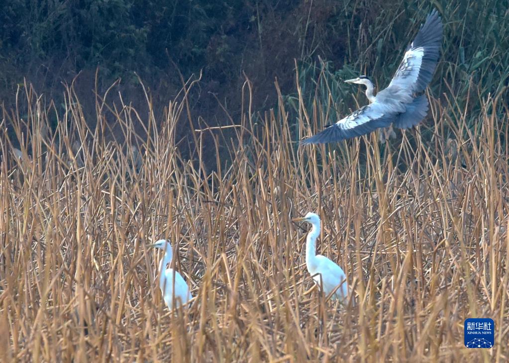 11月5日在安徽巢湖半岛国家湿地公园内拍摄的白鹭(下)和苍鹭。