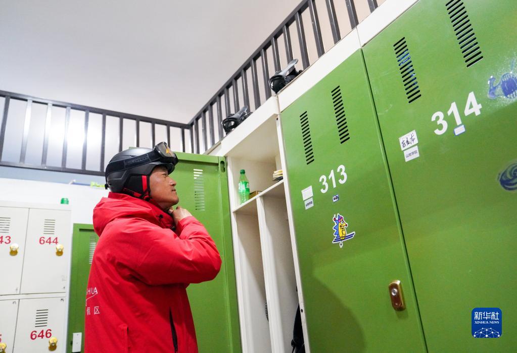 张占华在吉林市万科松花湖度假区更换滑雪装备(11月20日摄)。38岁的张占华是吉林市永吉县北大湖镇官地村村民。2016年开始,他利用冬天农闲时间来到吉林市万科松花湖度假区做滑雪教练。