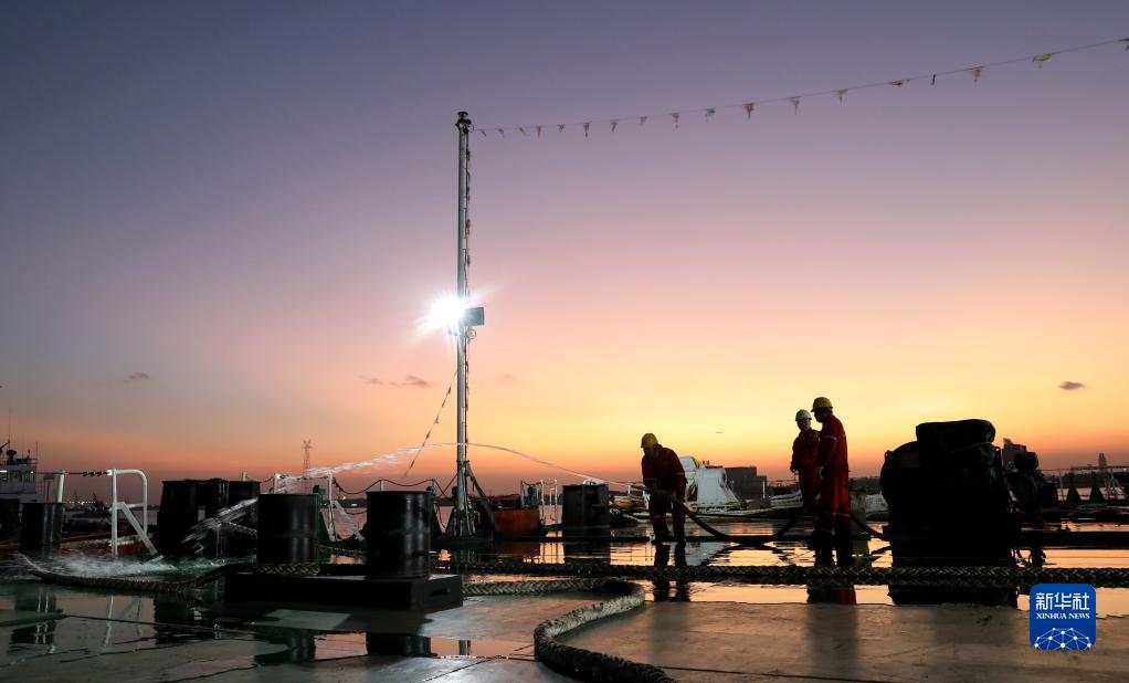 11月24日,工作人员在启航前清洗“奋力”轮甲板。