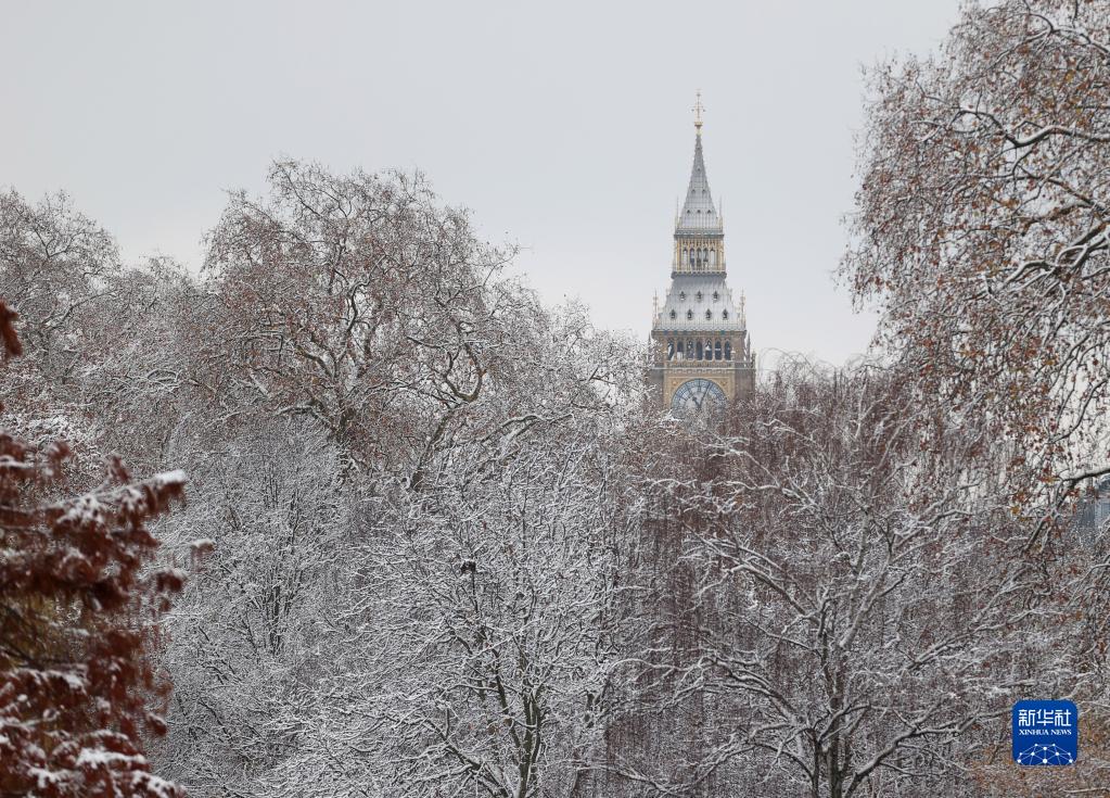 12月12日,英国伦敦大本钟前的树木被积雪覆盖。