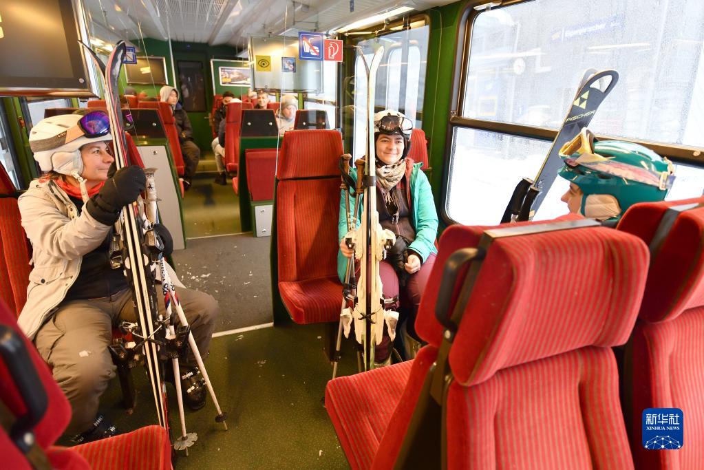 1月12日,在瑞士少女峰,滑雪好者乘坐火车下山。