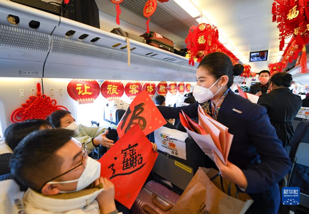 银川客运段工作人员在由银川开往兰州的D8933次列车上为旅客送上小礼物(1月19日摄)。新华社记者 冯开华 摄