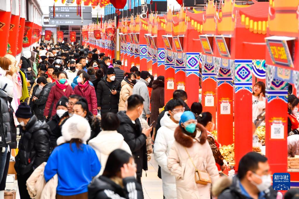 21日中午,湖北武汉市汉口里商业街,灯笼、福袋等各类春节饰品把街巷装扮一新,商贩们的吆喝声与游客的喧嚣声交融,一派红火。