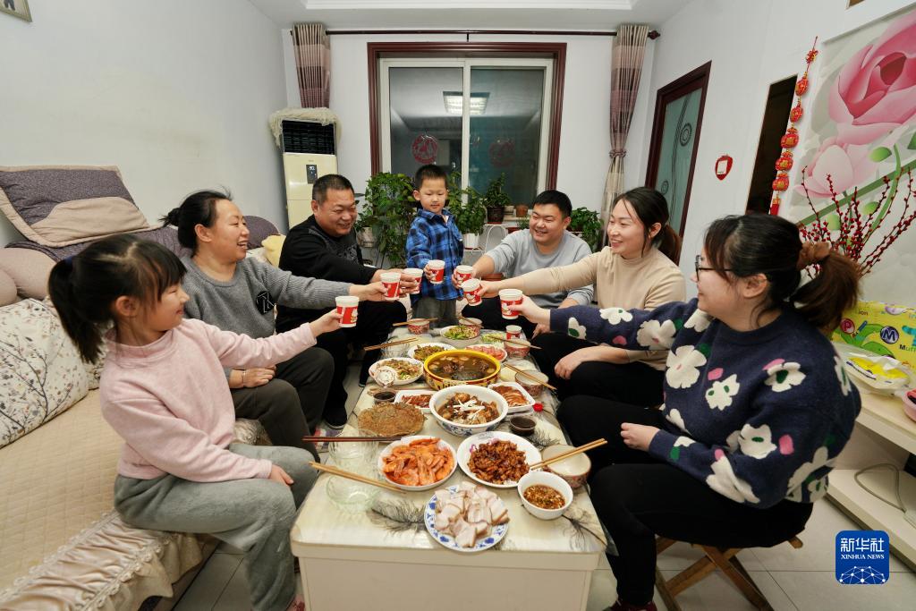 1月21日,河北邢台经济开发区春蕾花园居民张康(右三)一家在吃年夜饭。新华社记者 牟宇 摄