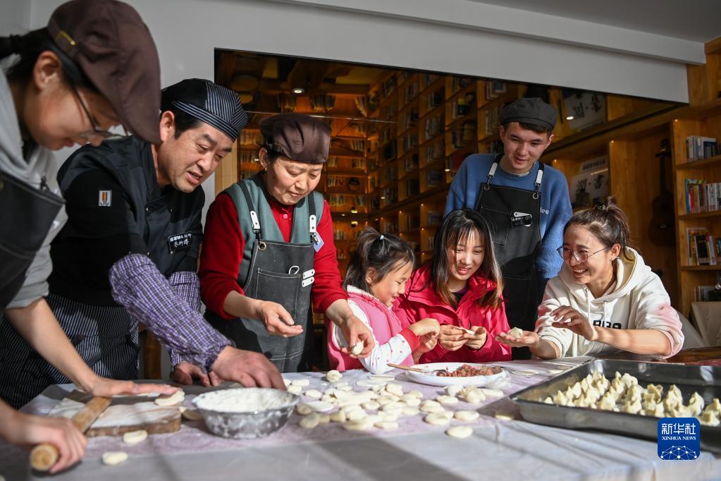 在位于新疆乌鲁木齐县板房沟乡的乐野民宿,来自广州的游客柳佳佳(右三)一家和民宿工作人员一起包饺子(1月20日摄)。新华社记者 丁磊 摄