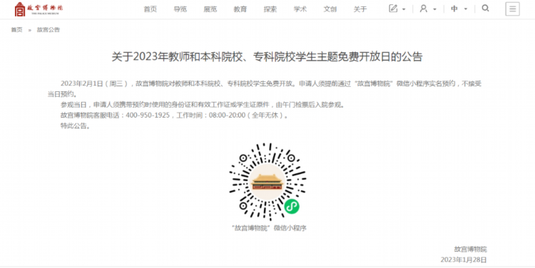 记者1月28日从故宫博物院获悉,2023年2月1日(周三),故宫博物院对教师和本科院校、专科院校学生免费开放。申请人须提前通过“故宫博物院”微信小程序实名预约,不接受当日预约。参观当日,申请人须携带预约时使用的身份证和有效工作证或学生证原件,由午门检票后入院参观。(记者王鹏、施雨岑)