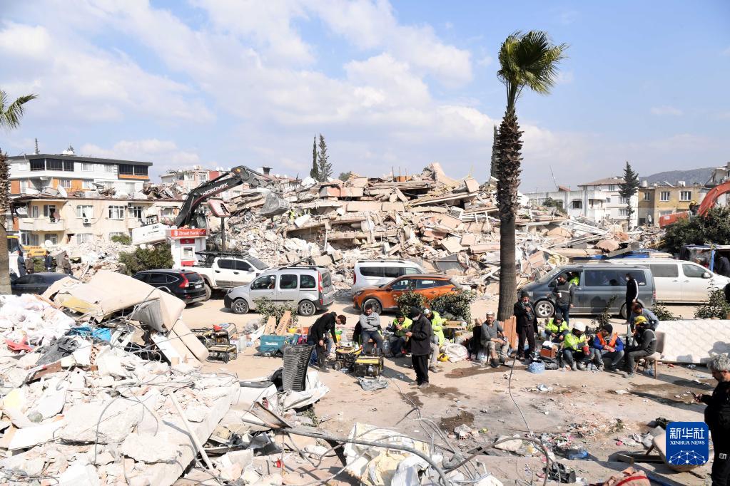 2月11日,救援人员聚集在土耳其哈塔伊省安塔基亚市的一处地震废墟附近。