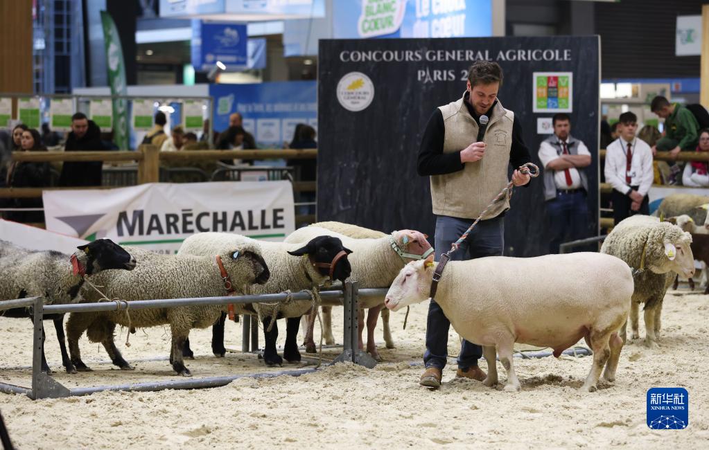 2月27日,在法国巴黎举行的第59届法国国际农业博览会上,养殖户牵着羊参加比赛。