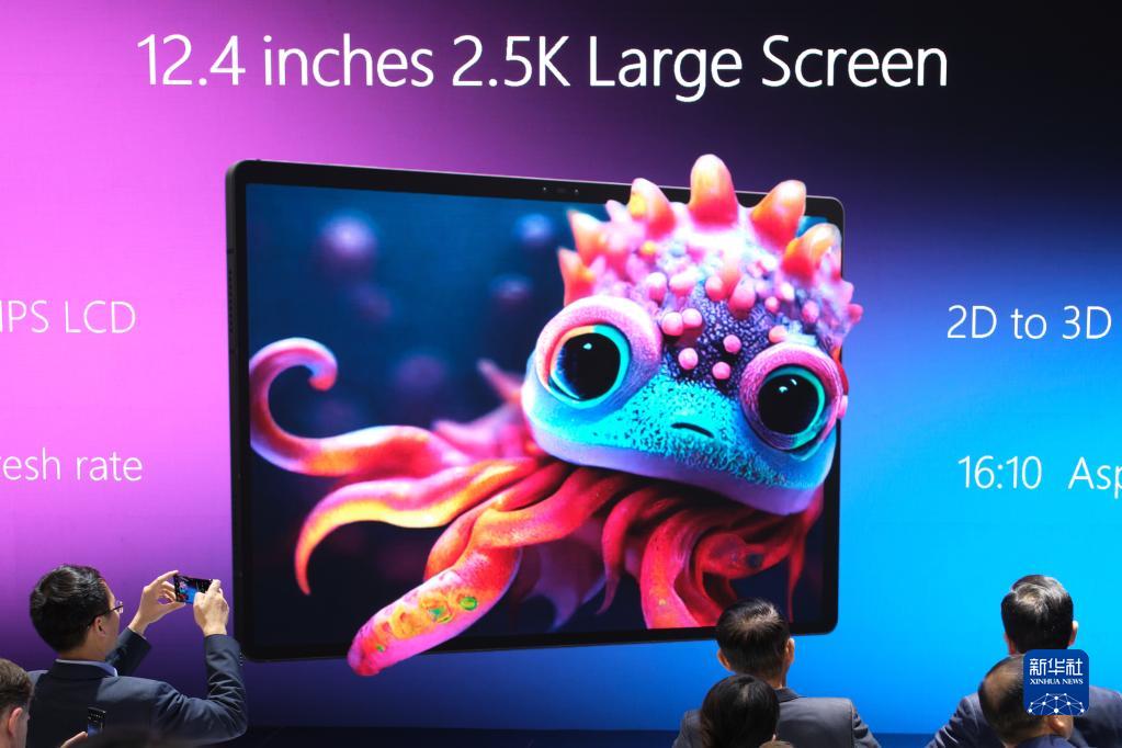 2月28日,在西班牙巴塞罗那,人们在世界移动通信大会上观看中兴裸眼3D平板电脑发布会。
