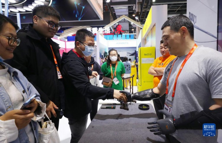 5月10日,在浙江省品牌推介展台上,参观者与安装脑机科技操控假肢的工作人员握手。