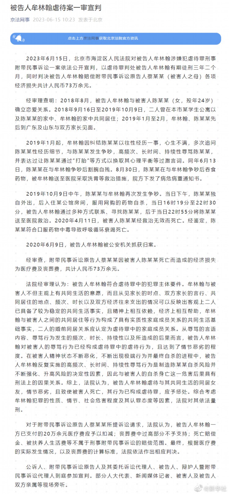 2023年6月15日,北京市海淀区人民法院对被告人牟林翰涉嫌犯虐待罪刑事附带民事诉讼一案依法公开宣判,以虐待罪判处被告人牟林翰有期徒刑三年二个月,同时判决被告人牟林翰赔偿附带民事诉讼原告人蔡某某(被害人之母)各项经济损失共计人民币73万余元。(记者:吴文诩)