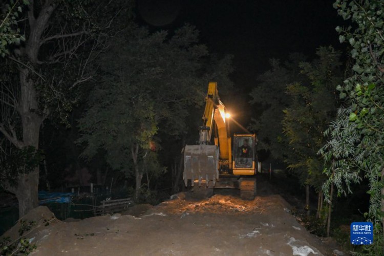 在天津市静海区大清河台头段南堤,大型工程机械夜间作业加固堤坝(8月7日摄)。