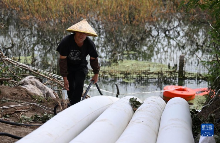 8月24日,工作人员在天津市静海区大清河南堤抽水现场整理大型抽水泵的电线。