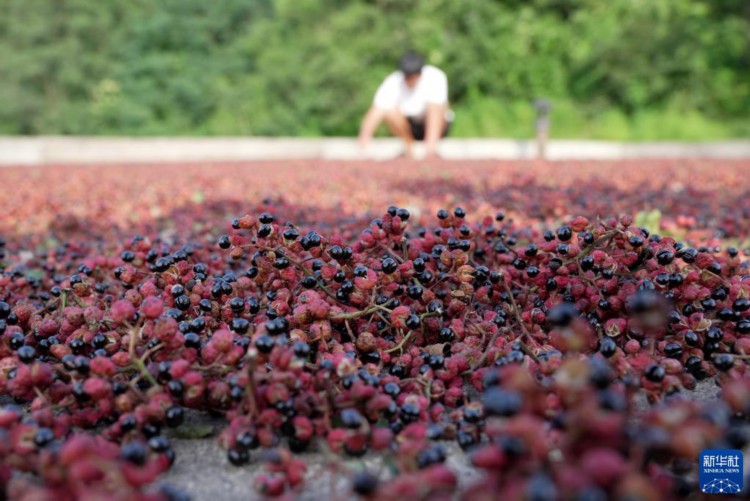 8月26日,秦皇岛市海港区石门寨镇南峪村的一位农民在晾晒收获的花椒。