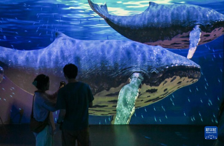 8月26日,游客在国家海洋博物馆“鲸奇物语”展区参观数字技术虚拟演示出的海洋生物。