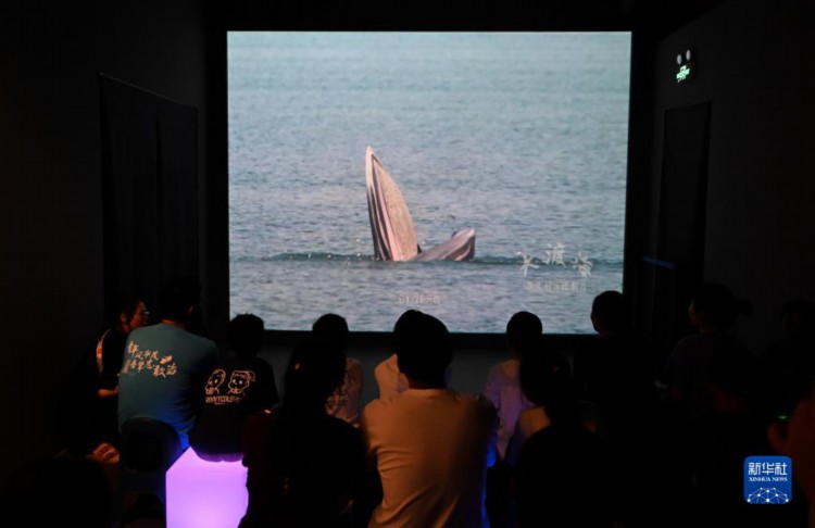 8月26日,游客在国家海洋博物馆“鲸奇物语”展区观看鲸鱼相关科普视频。