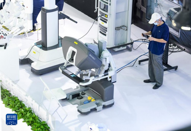 9月23日,一名观众在第六届中国-阿拉伯国家博览会医疗康养展区观看拍摄手术机器人。