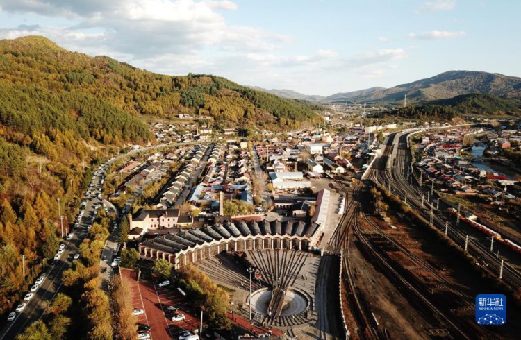 这是10月2日拍摄的横道河子中东铁路机车库遗址和部分俄式建筑(无人机照片)。