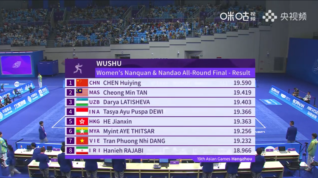 在26日结束的亚运会武术女子南拳、南刀全能比赛中,福州运动员陈惠颖技压群芳勇夺金牌,成绩分别是南拳9.790分,南刀9.800分(两项均位列第一),总分19.590分。