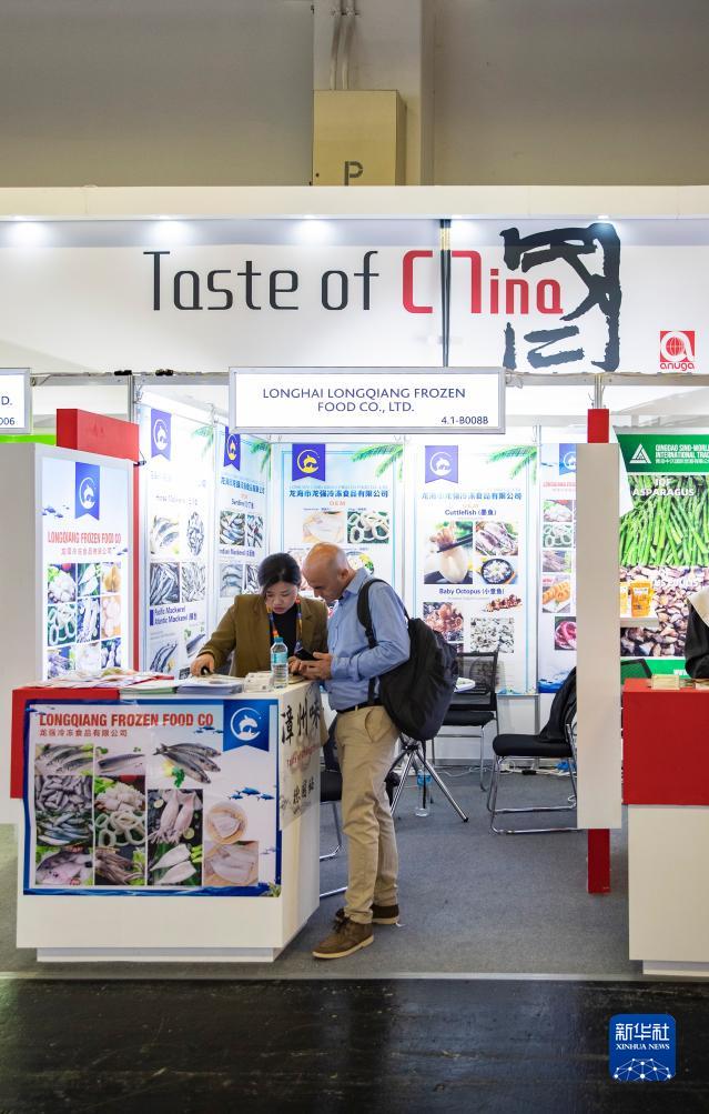 10月7日,参观者在德国科隆国际食品博览会的一个中国企业展台参观交谈。新华社记者 张帆 摄