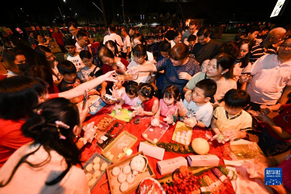 9月27日,在马来西亚马六甲州丹绒吉宁举办的中秋晚会上,人们参加制作月饼活动。