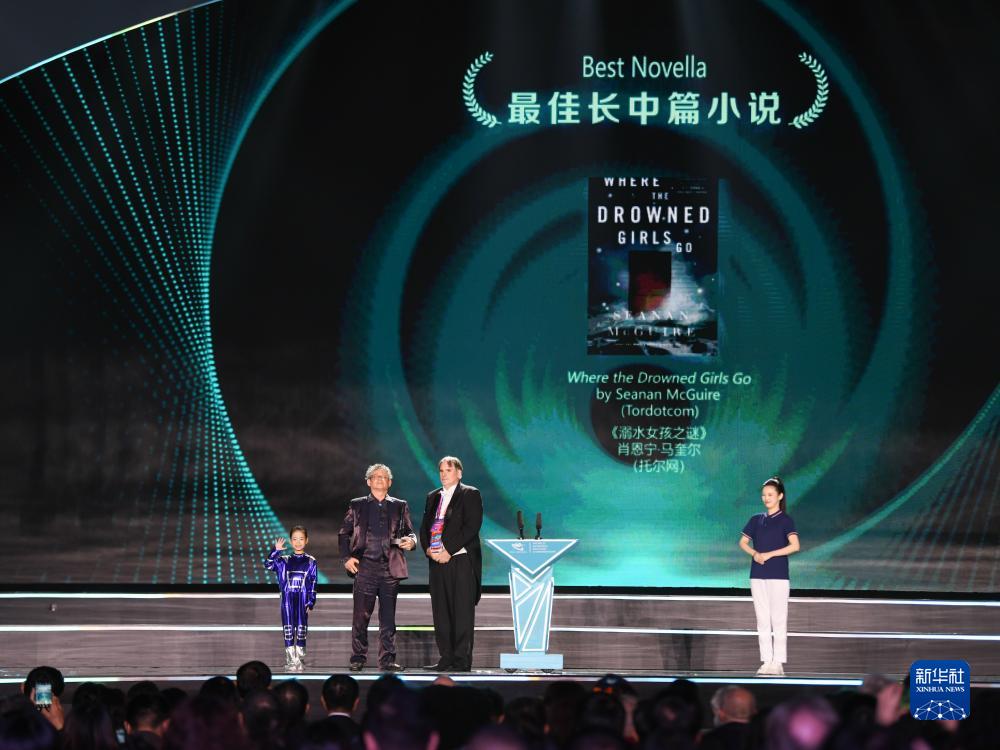 10月21日,嘉宾为最佳长中篇小说《溺水女孩之谜》颁奖。新华社记者 王曦 摄