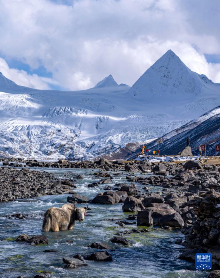 一头牦牛站在萨普雪山脚下的河流里(10月28日摄)。