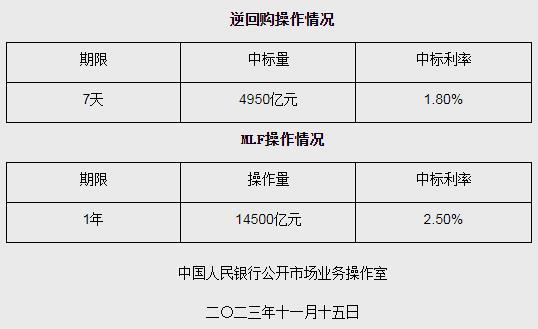 央行11月15日开展4950亿元逆回购操作和14500亿元MLF操作