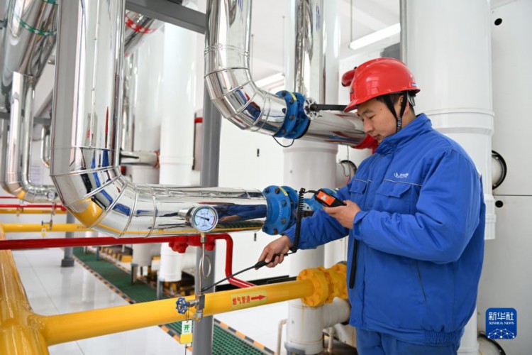 11月15日,唐山港能投智慧能源有限公司工作人员在唐山市路南区一处供热站内检查燃气管道密封性。