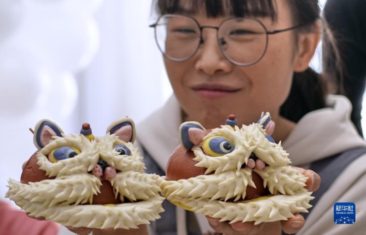 田晓展示她制作的面花作品《醒狮》(11月12日摄)。