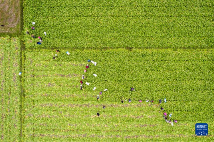 近日,湖南省益阳市南县种植的榨菜迎来丰收,村民们趁着晴好天气抓紧采收,削根、去叶、装袋,田间地头一派忙碌景象。今年南县榨菜种植面积约2万亩,总产值有望达到5000万元。