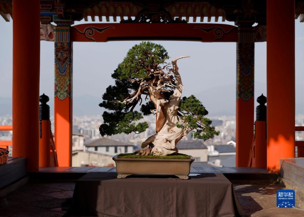 为纪念中日和平友好条约缔结45周年,中日盆栽水石展24日在京都清水寺开幕。尽显自然山水之美的盆栽作品与寺庙古建筑融为一体,吸引了大批游客驻足观赏。