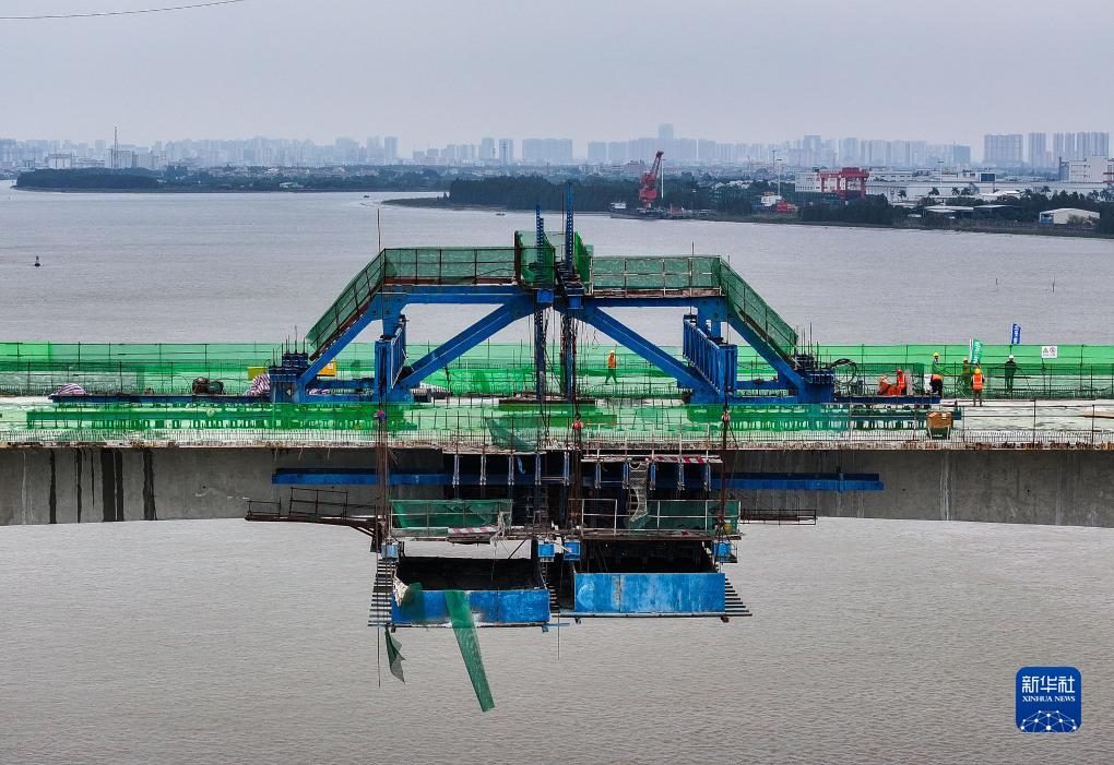 12月17日,施工人员在潭江特大桥主跨全幅合龙处施工(无人机照片)。