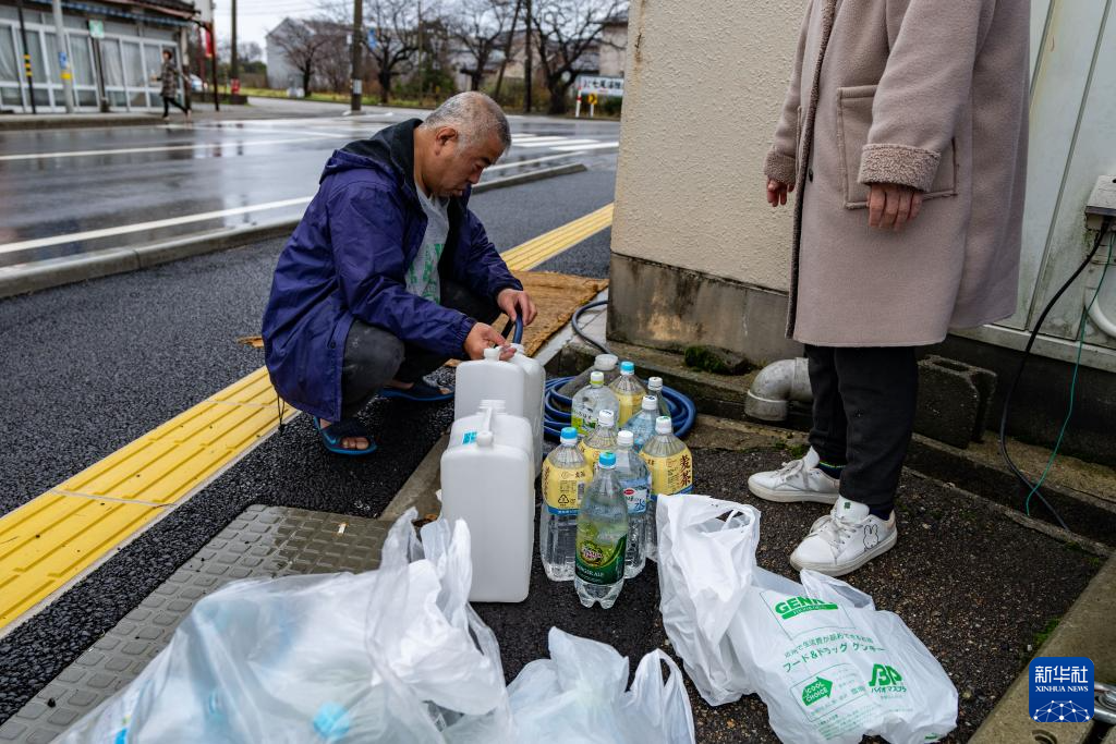 1月3日,日本石川县七尾市停水停电,一名市民在一个未使用市政水道的水产店接水。