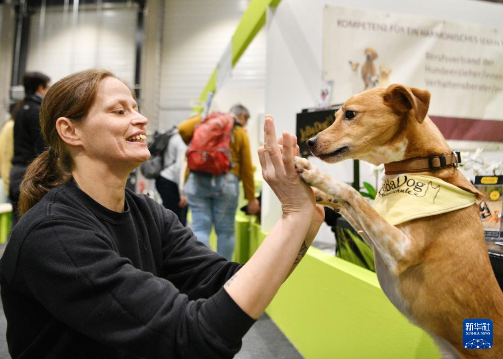 1月19日,参展商在德国柏林国际绿色周上与小狗互动。